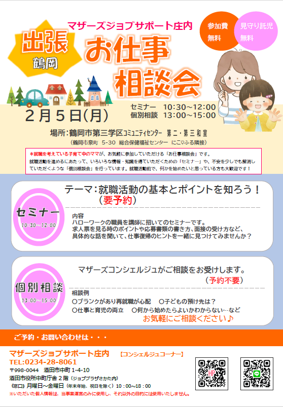 マザーズジョブサポート庄内おしごと相談会 in 鶴岡を開催します。【開催日】2月5日(月)【開催場所】鶴岡市第三学区コミュニティセンター 第一・第二和室(鶴岡市泉町5-30 総合福祉センターにこふる隣接) 【内容】10:30〜12:00 セミナー テーマ「就職活動の基本とポイントを知ろう!」ハローワーク職員を招いてのセミナーです。求人票を見るときのポイントや書類の書き方、面接の受け方など具体的な話を聞いて、仕事復帰のヒントを一緒に見つけてみませんか?※お申込みが必要です。13:00〜15:00 個別相談会・おしごとに関するお悩み・子育てに関すること・仕事と家事、子育てとの両立 など、お気軽にご相談ください。※どなたでもご利用いただけます、お申込みは不要です。 ♪お子さんと一緒に、お気軽にお越しください♪お子さんと同じお部屋でセミナーを受講し、相談することができます。保育スタッフが、ママをサポートいたします。 ★★利用者の方へお願い★★場合によっては、体調の確認をさせていただくことがございます。状況によっては、ご案内の変更をさせていただきます。あらかじめご了承ください。★★ーーーーーーーーーーーーーー★★ ◇お申込み・お問合せ◇マザーズジョブサポート庄内TEL:0234-28-8061メールでのお申込みはコチラ