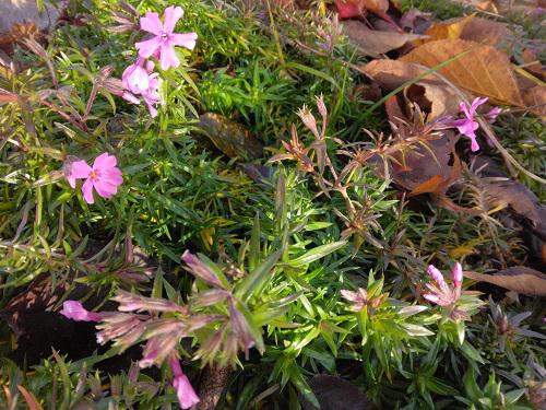 今日の朝は、雲の合間から明るい日差しが・・・ちょっともうかった気分になりました(^.^)予報では曇り、朝方は風がすごかったです!老犬サスケの散歩も大変だったようです・・・ (トップ写真)は・・・何にもなくなったさみしい庭ですが陽が射して、芝桜と落ち葉のコラボ!?  ↓先日アップした”ヒメツルソバ”まだ元気元気、、、増えて来年大変になりそうなので、じーじに頼んで根っこが残らないように全部駆除してもらいました。かわいらしい花なのに、かわいそうですが・・・  おまけですが。。。 じーじのアイデアで、古木を利用して“サルビアパープルボルケーノ”をこんな感じで植えています。これもコボレダネで増える品種なのですが銅葉が気に入ってこの周りは自然のままにしています。ちょっと雑木林風に・・・ ↓カラミンサが群生しているこのエリアです。10/21ブログより・・・  こちらは、ことしの作業ですが・・・↓通路の境のブロックがもろに見えるのが嫌みたいで”リュウノヒゲ”で自然に隠れるように植え込んでいました。   ↓このエリアです。。。よく見るとわかりますね。11/30ブログより・・・