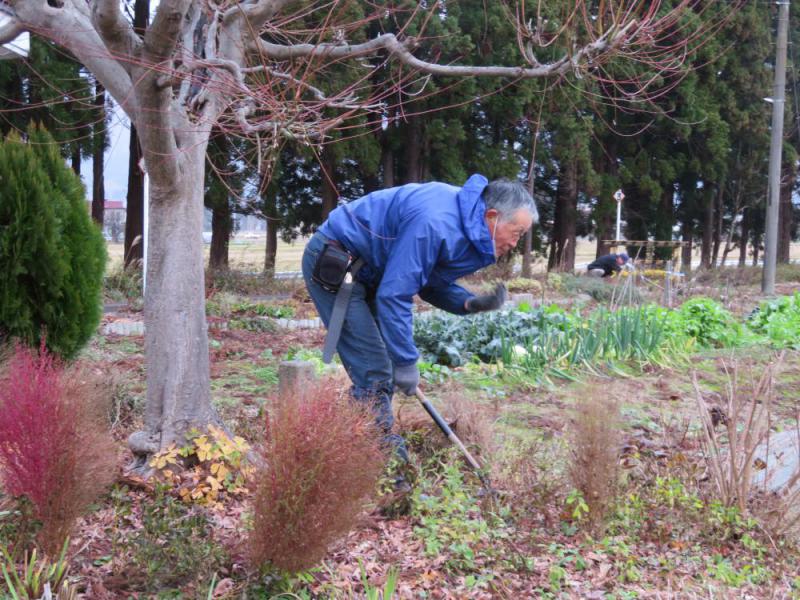 これまで雪囲いや電飾設置作業を紹介していましたが、この日は花壇の整理作業もしていました。枯れた茎などを除去していないと、来年にきれいな花が咲かないのだそうです。この作業を担当したのが、当会の園芸環境部長ともいうべきMさんとTさん。 さて、おらだの会にはMさんやTさんの他にも様々な特技・技術(?)を持った会員がいます。高い所が得意なK1さんは、屋根にたまった杉の枝を落とします。雨樋専門家のK2さんは、脚立に上って雨樋にたまった杉っ葉や土砂をかき出します。 コマーシャルではないですが、世界は誰かの仕事でできているものですね。おらだの会もみんなの仕事でできているんですね。