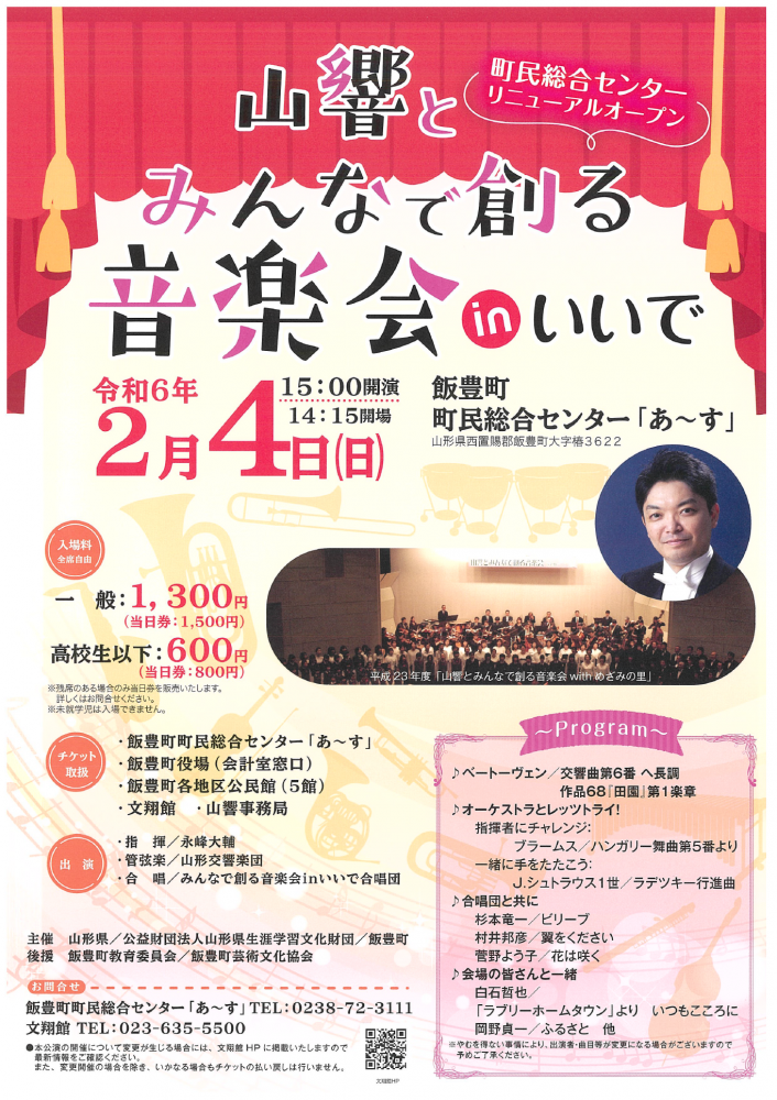 リニューアルオープンした飯豊町町民総合センター「あ〜す」にて、「山響とみんなで創る音楽会inいいで」が開催されます。山形交響楽団による演奏の他、会場の皆さんと一緒に合唱を行います。この機会にぜひ、ご来場ください。<日時>令和6年2月4日(日)15:00開演(14:15開場)<入場料>一般:1,300円(当日券:1,500円)高校生以下:600円(当日券:800円)<出演>指揮:永峰大輔管弦楽:山形交響楽団合唱:みんなで創る音楽会inいいで合唱団<問い合わせ>飯豊町町民総合センター「あ〜す」 0238−72−3111文翔館 023−635−5500詳細はコチラ