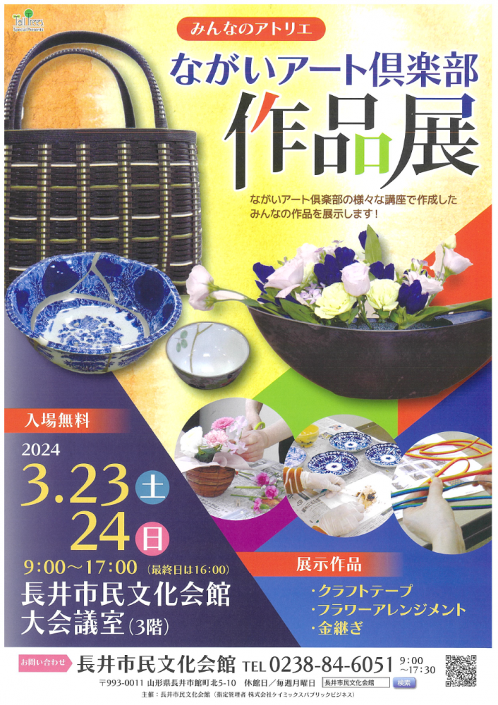 長井市民文化会館にて、「ながいアート倶楽部作品展」が開催されます。ながいアート倶楽部の様々な講座で作成した作品が展示されます。この機会にぜひ、ご来場ください。<日時>令和6年3月23日(土)、24日(日)9:00〜17:00※最終日は16:00<場所>長井市民文化会館大会議室(3階)<入場料>無料<展示作品>クラフトテープフラワーアレンジメント金継ぎ<問い合わせ>長井市民文化会館 0238−84−6051詳細はコチラ