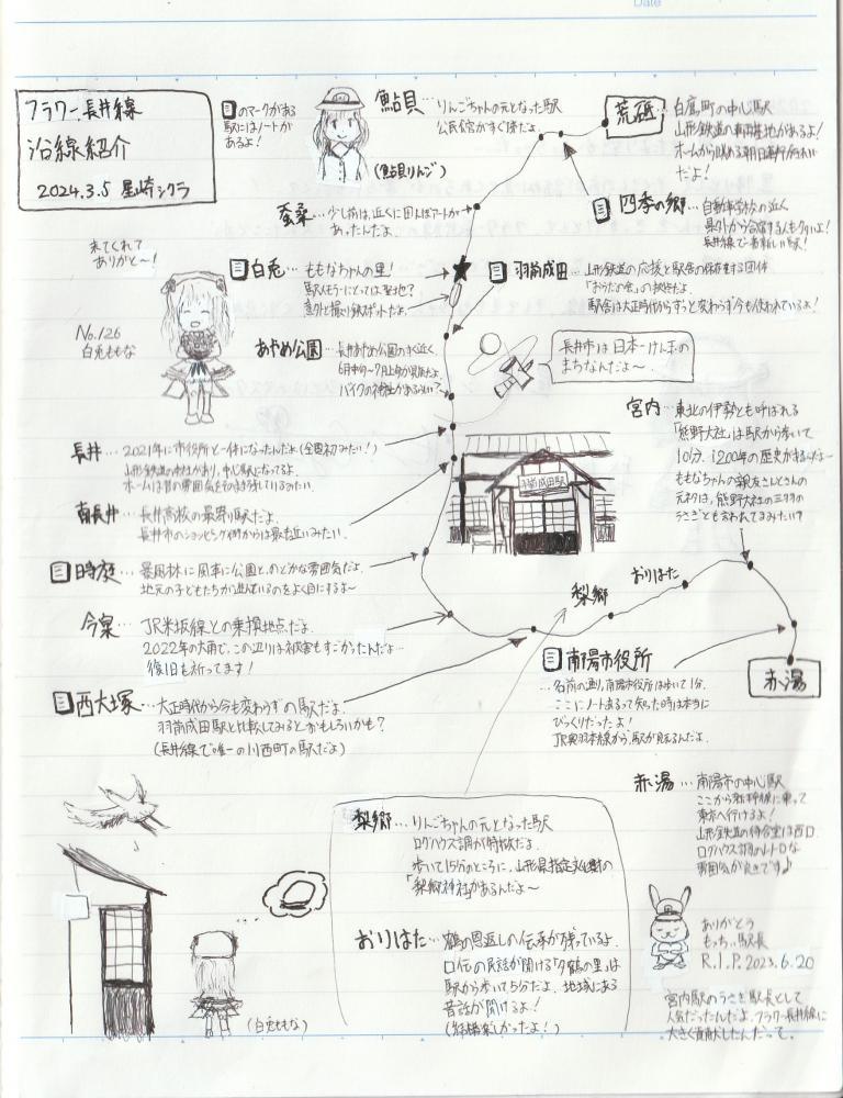 3月8日に「ももなさんをきっかけにして」と題して、星崎シクラさんの駅ノートをブログにアップした。星崎さんのその書込みが気になって、白兎駅に行ってみた。白兎駅のノートにはももなさんの誕生日や里帰りを祝うメッセージがたくさん寄せられていた。そして3月5日、フラワー長井線沿線紹介マップ(上の写真)を添えて星崎さんの書込みが続きます。?2023.07.29 駅メモももなさんのお里帰り達成。また来ます。(あおにゃん)2023.10.26 ももなさんの誕生日、里帰り達成。おめでとう!!(ぼうやぼうや)2023.10.26 ももなさんハピパ!!2023.11.19 遅ればせながら白兎ももなさんの里帰り記念に。来年は10月26日に来たいですね。(ざくろ仙台)2024.01.24 ももなさんの里帰り記念! 機会があればまた寄りたいです。(ふかふか&きから)2024.02.11 駅メモの温泉娘イベントの帰りに、ももなさんのご実家ということで訪問しました! 外寒い! うさぎかわいい! (るっる)2024.02.28 キュンパスでももな里帰り。思ったより雪少なかった。夕陽が差し込んでとても美しい。 (麻理藻)?2024.03.05 なんか思ってたより熱が入っちゃった・・・。里帰りとして、たくさんの方が訪ねて来てくれるのが本当に嬉しくて・・・! ももなちゃんをきっかけとして、フラワー長井線のことを知ってくれたことが本当に嬉しいんです! 皆様ありがとうございます!これからもフラワー長井線そしてももなちゃんのこと、よろしくお願いします!(星崎シクラ)??【おらだの会】来訪された方々への感謝の言葉と長井線とももなちゃんを応援して欲しいとの星崎さんの言葉が胸に響きます。2年前星崎さんが駅茶においでになって、「駅メモ」と「白兎ももな」のことを熱く語ってくれたことを思いだしました。こんな風に山形鉄道のことを考えてくれる人がいることには感謝の言葉しかありません。ありがとう、星崎さん。これからもよろしくお願いします。? 星崎さんとの最初の出会いはこちらから → ももなちゃんを知って欲しくて:おらだの会 (samidare.jp) → ももなちゃんをきっかけに:おらだの会 (samidare.jp)