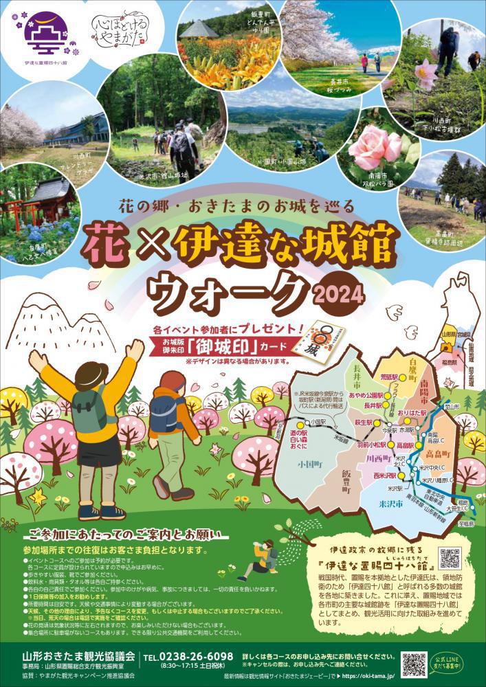 伊達政宗の故郷、置賜地域には各市町村の主要な城館跡「伊達な置賜四十八館(だてなおきたましじゅうはちだて)」があります。4月から7月までの間、「伊達な置賜四十八館」と「おきたまの花」を巡る「花×伊達な城館ウォーク」を実施します。地元ガイドが案内しますので初めての方でも安心して巡ることができます。参加者限定、お城版御朱印「御城印」カードのプレゼントもあります。この機会におきたまのお城を探索してみませんか。 ◇◇米沢市◇◇【伊達家舘山城跡と御成山から米沢を見る】伊達家にとって重要な山城であった館山城。山の上の広大な敷地に広がる土塁跡や石積をご覧ください。伊達政宗も眺めた米沢の風景をお楽しみください。※山を2つ登りますので、歩きやすい服装でご参加ください。※昼食は各自ご持参ください。 ●日 時:2024年6月8日(土)●集合場所:(スタート)JR西米沢駅 (ゴール)JR西米沢駅●集合時間:10:40●所要時間:約4時間25分●募集人員:20名●申込締切:5月31日(金)●主な見学先:国指定史跡 舘山城跡●お問合せ・申し込み:米沢観光コンベンション協会            TEL:0238-21-6226 ※米沢市以外のイベントコースはこちらをご覧ください。※詳細は各コースのお申し込み先にお問い合わせください。置賜城館名鑑 伊達な置賜四十八館はこちらをご覧ください。 【事務局】山形おきたま観光協議会     TEL:0238-26-6098