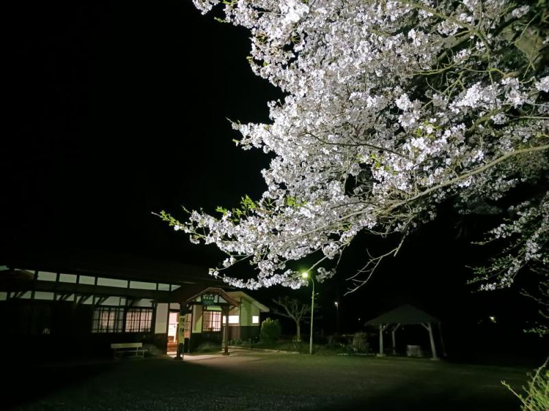 成田駅前の桜がライトアップされています。ライトアップして魅せてくれているのは、近くの(有)高橋鯉屋さんです。高橋鯉屋さんは、長井線の長井以降延伸の際に、線路の土盛り工事に自分の田んぼの土を提供。低くなった土地をどうすんべ、として始めたのが鯉の養殖業だったと云います。ですから、羽前成田駅と同じ年の操業になります。 そんな鯉屋さんは、桜の手入れを行い、そしてライトアップまでしてくれているのです。ライトアップの時間は夕方6時半から9時半まで、ご自宅の枝垂れ桜は午後9時頃まで点灯されています。関山やウコンなどが終わるまで点灯してくれるそうです。古い駅舎と共に、100年前に植えた人、100年の間守って来た人に思いを馳せながら眺めたいものです。 鯉屋さんの管理作業の様子はこちらから → 樹を守る人を忘れず:おらだの会 (samidare.jp)