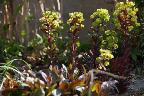 明日の朝は雨予想なので遅れてる鉢物の土替えを中心に作業を進めました。いつもながら古い土のやり場に困っているじーじです。それでもようやく形が整った庭を見てニンマリといったところです。(じーじのコメント) 今日のトップ写真は。。。銅葉の”ユーホルビア パープレア”と”ペンステモンダークタワー”(花は無し)です。 ↓わが庭の遅咲きの桜も満開〜 ↓あっという間に満開の”ジューンベリー” ↓『ネモフィラ』と”スイセン”のコラボ! 今年、じーじが制作した工作物、新しいコーナーが出来ました。ばーばのお楽しみコーナーでゲット〜!ミニガーデン風にしてみたいと思っていますが、まだ未完成で、進行中です!(ばーばに乗っ取られたようです) 昨日、久しぶりにカメラで庭の風景を撮ったじーじの写真があったのでUPしてみました。ばーばの写真では、チョット物足りなくて撮ってみたくなったのかな?いつもの事ですが、?スマホとばーばの腕前では上手く表現出来ません、、、