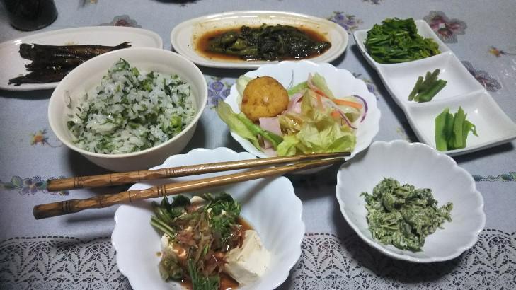 弟が川崎から帰省して、一週間ほど滞在、弟も完全リタイアして、自由な時間取れるようになって、兄弟で芦ノ牧温泉旅行、山菜採りと楽しみました、滞在中の朝食は山菜づくし、ウルイ、コゴミ、わらび、コシアブラ、ゴハンはウコギとコシアブラ入りで、おなかの調子も良くなります。