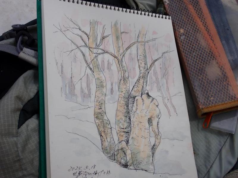 帰りがけ後藤さんが描いていたので皆で観察しました。ペン描きですが繊細を感じました。矮性のブナの巨木ですが迫力がありますね。各自の作品は博物園に展示します。