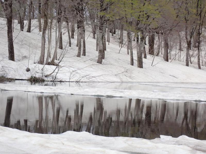 湖水群も開きました。ここ周海沼ももれず水面にブナ林が。