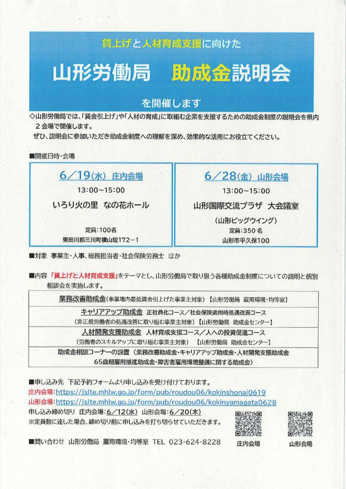 山形労働局よりご案内がありました。「賃金引上げ」や「人材の育成」に取組む企業を支援するための助成金説明会となりますので、ぜひご参加ください。 詳細等については山形労働局へお問合せ下さい。
