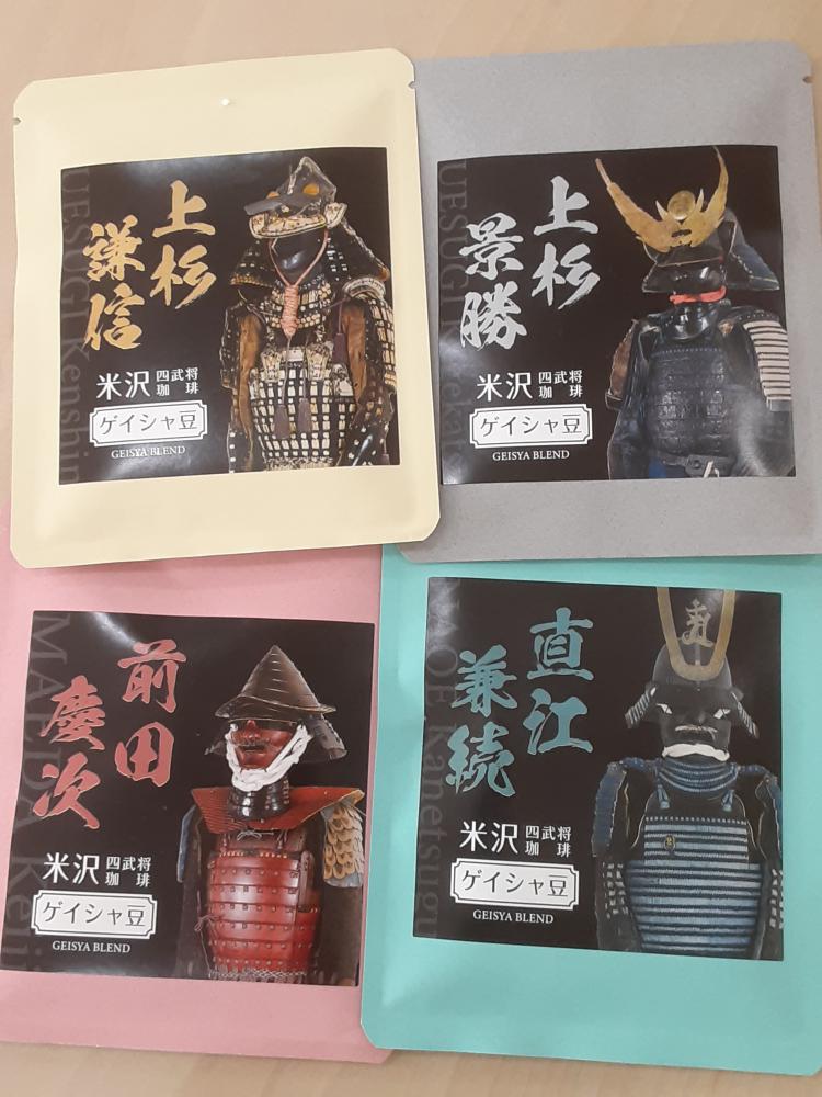 こちらは 一杯分の レギュラーコーヒーです。上杉謙信、上杉景勝、直江兼続、前田慶次の パッケージです。 米沢の お土産にも おすすめです。