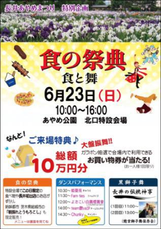 食の祭典 日時:6月23日(日) 10:00~16:00会場:長井あやめ公園 北口特設会場 例年、好評をいただいております「食の祭典」を開催!長井市の美味しいお店や長井市外のお店あわせて15店舗が集結。ご来場特典♪  総額10万円分のお買い物券が当たる!ガラポン抽選で会場内で利用できるお買い物券が500名様に当たる!(お1人様1回限り) ◆━━━━━━━店舗紹介━━━━━━━━━◆高橋鯉屋・水上屋・菅製麩所・じんぐう寺農園・長沼酒造・はぎ苑・須藤米店・アイデアのおもちゃ箱・草岡ハム加工組合・CONCEPT-99MILKS・ガルバンゾー・SUKOFRU・東菓茶(初)・はまだ牧場ジェラート工房(初)・HAVE A GOOD SLICE(初)◆━━━━━━━━━━━━━━━━━━━━◆姉妹都市「茨城県結城市物産展」朝採れとうもろこし販売!10:00~ 売り切れ次第終了。お早めにお越しください。 また、ダンスパフォーマンス・黒獅子舞も見どころ満載です。タイムスケジュール10:30~ 姫憂兎(きゅうと)  11:30~ Fam ties(ファムタイズ)12:00~ よさこい白鷹櫻鷹會(しらたかおうようかい)初参加  14:00~ team艶ya沙(チームえんやさ)  14:30~ Chunky(チャンキー) 長井の伝統神事 黒獅子舞(總宮獅子舞保存会) 【1回目】11:00~ 【2回目】13:00~ 皆様のお越しをお待ちしております。
