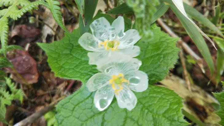 天元台高原第三リフト降り場1820m、西吾妻の最短登山口に咲くサンカヨウの花、昨日は、運よく、水にぬれて花が透明になっているのを観ました。陽が射して、すぐに白に戻りましたが・・。先週の6月8日土曜日のオープン日は咲いていなかった登山口に咲くサンカヨウの花、今週の火曜日あたりから咲き始めてます。漢字で”山荷葉”と書く、その”荷葉”とは”連の葉”を指すといい、山に咲く連のような葉をもつ花という意味を持つ、今は小さいがいずれ大きな葉になり黒い実をつけます・・