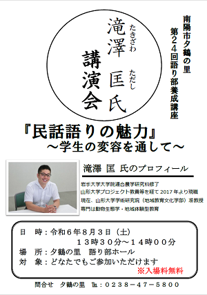 講演内容は、山形大学学術研究院(地域教育文化学部)・准教授の滝澤 匡 氏が、「民話語りの魅力〜学生の変容を通して〜」という演題で、講演していただきます。
