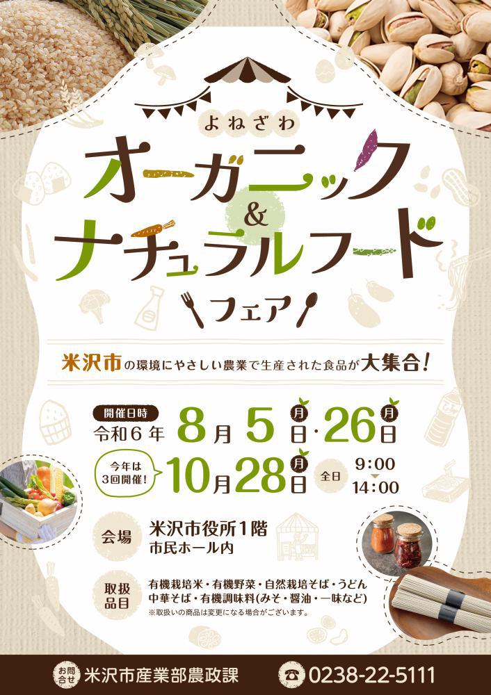 有機栽培など、環境にやさしい農業で生産された食品が米沢市役所に集合します。米沢市の生産者が丹精込めてつくった野菜、そばやうどんなどの乾麺、お米など、バラエティに富んだいろんな食品をご用意して、皆様のご来場をお待ちしております。お近くに来られた際は、ぜひお気軽にお立ち寄りください。・開催日時 令和6年8月5日(月)・8月26日(月)・10月28日(月)※3回開催全日9:00〜14:00・会 場米沢市役所1階 市民ホール内・取扱品目有機栽培米・有機野菜・自然栽培そば・うどん・中華そば・有機調味料(みそ・醤油・一味など)※取扱いの商品は変更になる場合がございます。・お問い合わせ米沢市産業部農政課 TEL:0238-22-5111