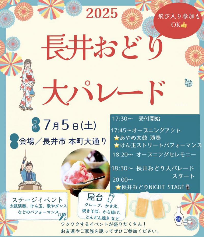 ■期 日 令和7年7月5日(土) ■会場/コース 本町大通り ◆本町大通り周回コース(中央十字路〜菜なポート 区間) 約300M 周回コース★今年もたくさんの踊り手のご応募いただきありがとうございます! ◎雨天決行 (参加につきましては各団体にてご判断ください)◎大雨、警報・注意報発令の場合は中止。延期はありません。 ■スケジュール 17:45 オープニングアクト ★あやめ太鼓演奏 18:00 ★けん玉ストリートパフォーマンス 18:30 長井おどり大パレード スタート 19:55 長井おどり大パレード終了 20:00 長井おどりNIGHT STAGE ★ファムタイズ ★井上千春 × シークレットゲスト 21:00 イベント終了※スケジュールは参加人数等により前後する可能性があります。 ご参加の皆様には最終のご案内で集合時間・場所等をお知らせします。 ★売店、キッチンカーも来ます! 踊り子の皆さま、最後まで楽しく踊りましょう(^^♪※熱中症対策は、各団体・各自で十分にお気を付けください。 ・゜゚・*:.。..。.:*・*:゚・*:.。. .。.:*・゜゚・**・゜゚・*:.。..。.:*・*:゚・*:.。. .。.:*:.。. .。.:**:.。. .。.:*:.。. .。.:* 【長井市観光協会 公式アカウント】長井市観光協会ではFacebook・Instagramのアカウントを作成しております。是非お目通しくださいませ(*^ω^*)!!FacebookInstagram