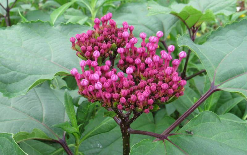 ●手毬状のピンクの花を咲かせる「ボタンクサギ」が今にも咲きそうです「牡丹臭木」と書きますが読んで字のごとし牡丹のような花が咲き茎や葉を傷つけると独特の香りがすることにちなだ名前だそうです まだ蕾ですので咲いたらもう一度写真を撮りに出向いてアップします