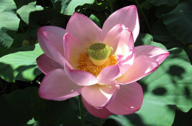 ●NHKローカルニュースで米沢市の上杉公園の「ハス」の花が紹介されました 早速見てきましたが一面の緑の葉の中にピンクの花がひときわ目立ちました あまりきれいではない水でも咲く花で花言葉は「清らかな心」とされそんな雰囲気の花です 仏教とともに伝来したと言われ古くから使われた名で仏壇を彩る花で仏教と深いかかわりのある花のようです 葉の上でコロコロと転がる水玉がとても印象的です