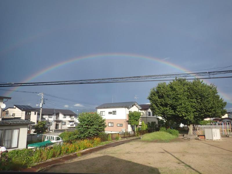 家でぼんやり。僅かな雨の後北東の空にくっきりと七色のレインボウが。