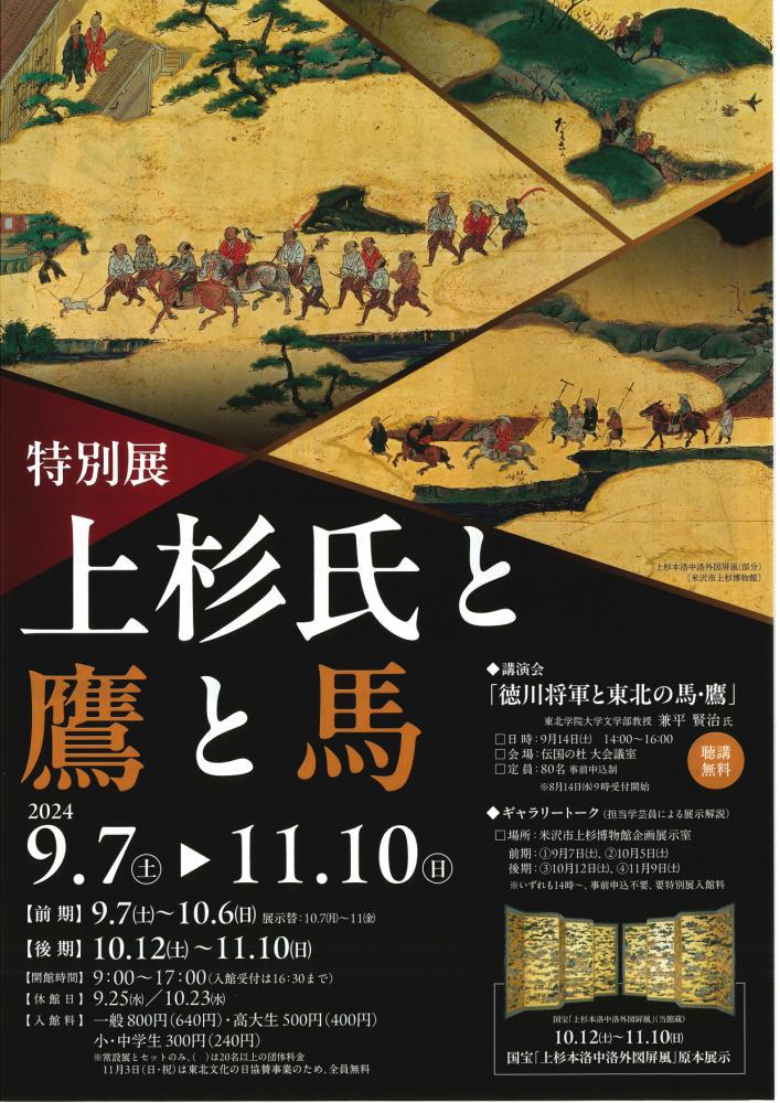 前期:9月7日(土)〜10月6日(日)後期:10月12日(土)〜11月10日(日)※展示替:10/7〜11休館日:9/25(水)、10/23(水)開館時間 9:00〜17:00(入館受付は16:30まで)国宝「上杉本洛中洛外図屏風」原本展示期間:10月12日(土)〜11月10日(日)入館料 一般800円(640円)    高校・大学生500円(400円)    小・中学生300円(240円)    ( )内は20名以上の団体料金です。 お得な共通入館券米沢観るパスもございます。主 催:米沢市上杉博物館 鷹、馬と人間の付き合いは、長い歴史を持ちます。六世紀ごろの古墳から出土した鷹、そして鷹匠、馬、そして馬子をかたどったハニワは、それを知らしめてくれます。また、それらは権力者との強いつながりを示しています。以後も鷹や馬は権力と強く結びつき、その象徴的存在として歴史にその姿を刻んでいます。本展は、戦国時代から江戸時代における上杉氏を中心とした武家権力と鷹と馬との関わりをみていきます。 鷹や馬は、大名と室町幕府や豊臣政権、江戸幕府との関係のほか、大名同士の関係においても重要な役割を果たしました。鷹狩は広く武家が愛好し、乗馬は移動のみならず、戦いにおいても武家に必要とされました。そこで、鷹狩や乗馬の技術が重視され、狩猟能力にたけた鷹や、名馬が求められました。また、鷹や馬を飼育したり、けがを治療したりする技術も重視されました。 このような中で戦国時代から江戸時代には、鷹や馬を題材とした障屏画が盛んに描かれました。武家が絶対的権力を握った社会的風潮の反映ともいえます。国宝「上杉本洛中洛外図屏風」にも多様な鷹や馬の姿が描かれています。 以上のような視点から、鷹や馬を通した上杉氏の歴史の一端に触れていただきたいと思います。■ギャラリートーク(担当学芸員による展示解説)※申込不要  前期:9月7日(土)、10月5日(土) 後期:10月12日(土)、11月9日(土) ※いずれも14:00〜、企画展示室にて、要特別展入館料  担当:阿部哲人(当館学芸員)■講演会「徳川将軍と東北の馬・鷹」・日時:9月14日(土)14:00〜16:00    ・講師:兼平賢治  氏(東北学院大学文学部教授)・会場:伝国の杜2階 大会議室・定員:80名(先着)※8月14日 受付開始  聴講無料