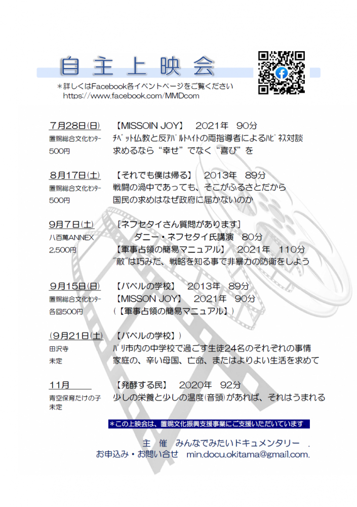 置賜総合支庁、置賜3市5町の文化行政担当部局、各市町の芸術文化協会などで組織する置賜文化フォーラムでは、置賜地域の文化振興と地域活性化を図ることを目的に、置賜地域の住民が主体となった文化事業に対し、補助金を交付しています。今年度採択された「みんなでみたいドキュメンタリー」では、ドキュメンタリー映画を通じた交流事業として、指定の期日にドキュメンタリー映画を上映いたします。9月に下記の上映を予定しておりますので、ぜひ、ご来場ください。@<映画>最初の54年間 軍事占領の簡易マニュアル※映画上映後、ダニーネフセタイ氏による講演が行われます。<上映日>令和6年9月7日(土) <場所>八百萬ANNEX<料金>2,500円A<映画>・バベルの学校・MISSON JOY<上映日>令和6年9月15日(日) <場所>置賜総合文化センター<料金>各回500円<問い合わせ>みんなでみたいドキュメンタリーmin.docu.okitama@gmail.com※詳細な時間は、下記Facebookページをご覧ください。https://www.facebook.com/MMDcom 詳細はチラシをご覧ください。