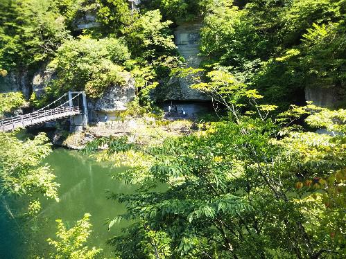 那須岳登山して、鬼怒川温泉泊した帰り道、通ってはいたが、寄ったことのなかった、塔のへつりに行ってきた・・住所が福島県南会津郡下郷町弥五島・・長い年月をかけて自然が作り出した渓谷、塔の形が立ち並ぶ断崖という意味から「塔のへつり」と名ついている・・へつりとは地元の言葉で断崖のこととあります。反対側にある断崖までは吊り橋が架けられ、断崖の内部へといける、断崖のあちこちに賽銭なのか岩に張り付けている・・なかなか起用につけているもの、頭頂部でも落ちないで張り付いているのがいくつもある・・1943年に国の天然記念物に指定されているという