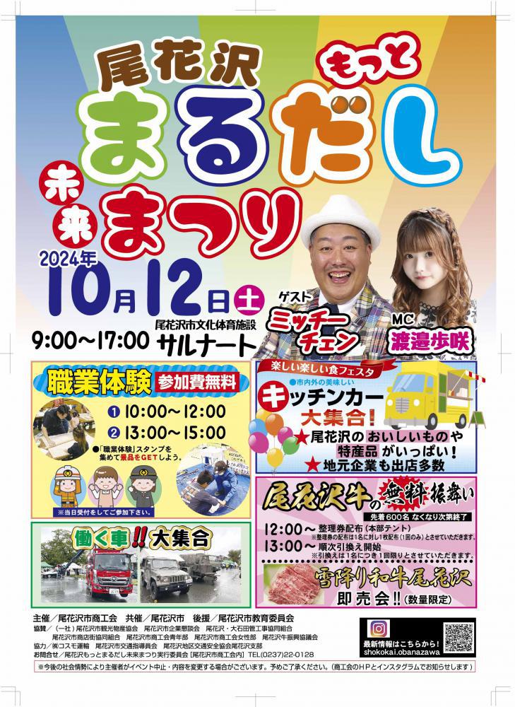 10月12日(土)9:00〜17:00尾花沢もっとまるだし未来まつりを開催いたします!昨年も大好評だった職業体験イベントに、今年は雪降り和牛尾花沢の無料振舞いイベントを実施いたします!皆様のご来場お待ちしております。 今後イベントの最新情報等は、尾花沢市商工会インスタグラムで発信いたします。インスタグラムQR↓