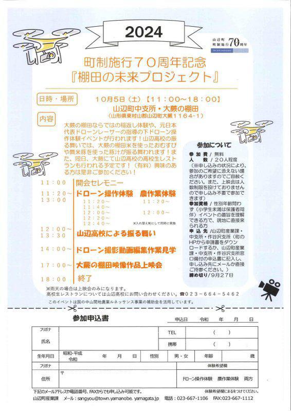 10月5日(土)に「大蕨の棚田」で農作業体験やドローン操作体験のイベントが行われます。昼食には、大蕨の棚田米を使ったおむすび、舞米豚の豚汁が振舞われます。参加は無料ですが、申し込みが必要です。ぜひご参加ください!  日時:10月5日(土) 11:00〜18:00 場所:山辺町中支所・大蕨の棚田 (山辺町大蕨1164-1) 申し込み先:山辺町産業課   TEL:023-667-1106 FAX:023-667-1112   メール:sangyou@town.yamanobe.yamagata.jp
