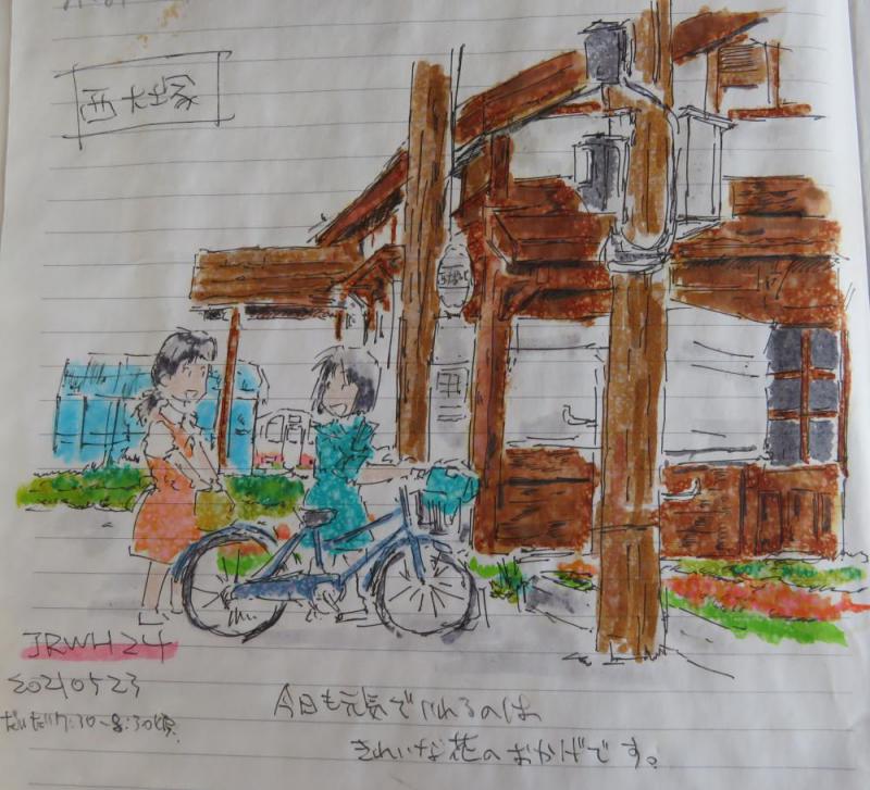 「駅に集う人々」と題して、10年もの長い間にいろんな人が西大塚駅に心を寄せてくれた歴史を振り返ってきた。私たちはこうした応援団に感謝すると共に、この駅を守ってきた地元の人がいたことを忘れてはいけないだろう。? NHKアーカイブでのアナウンスやまちづくりNPOセンターのブログに、そのことがさりげなく書かれている。西大塚駅の駅ノートに残されたイラスト(写真)には、「今日も元気でやれるのはきれいな花のおかげです」と添えられてあった。またある方から、無人の駅であっても地元の人の顔が見えるような温かい駅があるものです、と言われたことがある。? さて昨日はローカル線プロレス2024があり、西大塚駅前はたくさんの人で賑わったことだろう。そこに集った人たちに「きれいな花」は見えたのだろうか。110歳の駅舎に集まった人たちが、ローカル線の温かさと人々の優しさを感じてくれたことを信じたい。