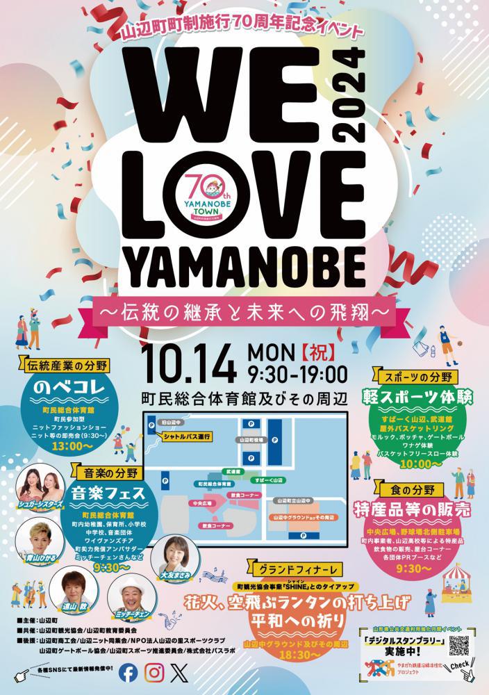 山辺町町制施行70周年記念イベント『WE LOVE YAMANOBE 2024』が開催されます!ニットファッションショーや音楽フェス、特産品販売、花火や空飛ぶランタンの打上げ等、山辺町の魅力満載なイベントです!日時:10月14日(月) 9:30〜19:00場所:町民総合体育館及びその周辺