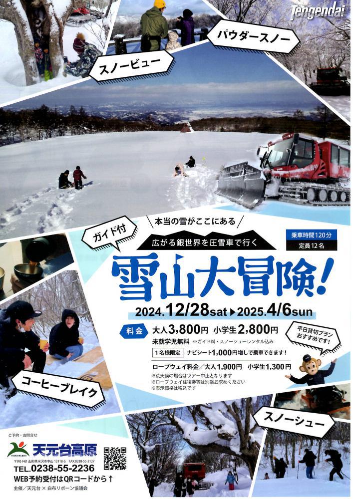 標高1,200mからの絶景、パウダースノーの銀世界、雪山だからできる体験をキャビンに乗って大冒険へ出発!みなさん、ぜひお越しください!◇開催期間 2024年12月28日(土)〜2025年4月6日(日)※乗車時間120分/定員12名※要予約(予約締め切り 前日16:00まで)◇料 金  大人3,800円 小学生2,800円 ※未就学児は無料※ガイド料・スノーシューレンタル込み※1名様限定/ナビシート1,000円増しで乗車できます。※ロープウェイの乗車料金が別途必要になります。ロープウェイ料金/大人1,900円 小学生1,300円◇NEW!平日限定貸切プランが登場!料金:1クール20,000円(最大15名まで)運行時間:出発時間を選択できます。午前出発9:30〜10:00・午後出発13:00〜13:30の時間帯より指定可能※所要時間は短縮されるため応相談特典:スキーウェア(ウェア・パンツ)貸出無料・要予約【予約・お問合せ】天元台高原 TEL:0238-55-2236■予約フォーム/https://airrsv.net/tengendai/calendar