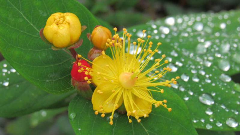 ●昨夜の雨に濡れた庭の花木が長いおしべをつけた黄色の花が今頃も咲き赤い実をつけています 暖かさに誘われたのか新しい枝先にい黄色の花を咲かせその花が紅い実となりました ネットで「ピペリカム」とヒットしました ラテン簿名で日本原産のものをオトギリソウといい輸入されたものと区別しているそうです 本当にピペリカムでしょうか