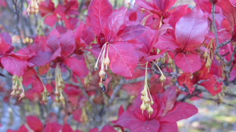 ●ドウタンツツジの仲間の「アブラツツジ」が紅く色づき果実が垂れ下がってついていました 5〜6月に咲く花はドウタンと似ているが花の茎が2〜3cmの長さで垂れ下がっているそうです これが秋になると垂れ下がった実になるようです 秋の紅葉はひときわ美しく陽ざしによっては蛍光色のように見えることもあるそうです 観てみたいです