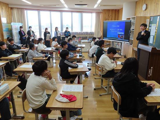 11月14日、県立保健医療大学の安保寛明先生をお招きし、SOSの出し方講座が行われました。ストレスとは、「脳と心ががんばって疲れる」という意味であり、いやなことだけでなく、気晴らしのつもりでもかえってストレスになってしまうことがあることを教えていただきました。また、「心が疲れている」と感じたときは、SOSを出して助けてもらうことや自分のいいところを思い出してみることが必要であることも学びました。最後に、大事なこととして、自分で自分をかわいがる、自分が安全だ、安心だと思える時間や場所をつくる、苦手で引き受けるのがつらいことは「苦手なんだ」と伝えてみるという、自分をいたわる(大事にする)方法に時間を割くことの大切を勉強しました。※山形新聞11月17日の朝刊にも掲載されましたので、ご覧ください。