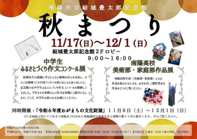 現在、記念館2階ロビーを会場として「秋まつり」を開催中です。今年度の「中学生ふるさとづくり作文コンクール」の受賞作をご覧いただけるほか、南陽高校家庭部・美術部の皆さんによる力作の数々をお楽しみいただける、秋にふさわしい展示です。ぜひ皆様足をお運びいただき、若い力に触れていただければ幸いです。