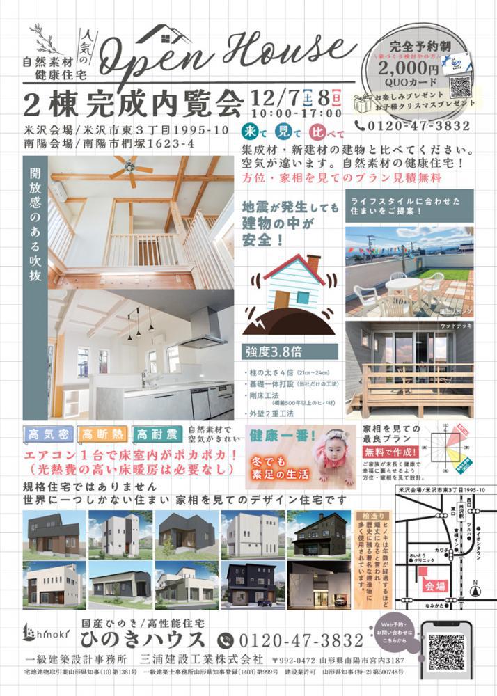 向寒の候 皆様におかれましては、益々ご清祥の事とお喜び申し上げます。さて、この度、南陽市椚塚地区、米沢市東地区におきまして『2棟完成内覧会』を開催いたします。「高断熱で省エネ」、「高耐震・高耐久で案内」、「世界に一つの家」特化したひのきハウス!マイホームをお考えの方、リフォームをお考えの方、この機会に弊社の無料相談会をご利用くださいませ。スタッフ一同、お待ちしております。 ●日 時:12月7日(土), 8日(日) 10:00〜17:00 ●南陽会場:南陽市椚塚1623−4 米沢会場:米沢市東3丁目1995-10 ●来場者得点: @お子様クリスマスプレゼント Aお楽しみプレゼント B前日までの予約特典 2,000円分のQUOカード ( 家づくり検討中の方 ) ●ご連絡先 :0120−47−3832 ※完全予約制となりますので、予めご連絡お願いいたします。 三浦建設工業スタッフ一同、皆様のお越しを心よりお待ちしております。