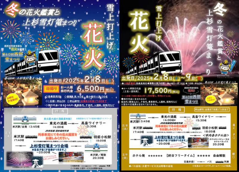 道の駅米沢 総合観光案内所より、雪上打ち上げ花火&上杉雪灯篭まつりが楽しめる、観光プランのご案内です。◇日帰りプラン◇出発日:2025年2月8日(土)料 金:お一人様 6,500円(旅行代金に含まれるもの:乗車券代、夕食代、入館料、保険代等)添乗員:あり募集人員:40名※最少催行人員30名申込締切:出発日3日前 17:001名様〜申込可能移動手段:バス(三愛サービスまたは同等の会社)及び列車 行程:13:45頃 米沢駅出発14:00頃 東光の酒蔵15:30頃 高畠ワイナリー17:40頃 米沢駅〜車窓から雪上打ち上げ花火をお楽しみいただけます〜18:05頃 羽前小松駅20:00頃 上杉雪灯篭まつり会場にて各自夕食※夕食券付き20:30頃 米沢駅解散 ◇ご予約はこちらから ◇宿泊プラン◇出発日:2025年2月8日(土)〜2月9日(日)※1泊2日料 金:お一人様(2名一室) 17,500円(旅行代金に含まれるもの:宿泊代(朝食込み)、夕食代、乗車券代、入館料、保険代等※翌日の交通料は含まれておりません)添乗員:あり募集人員:40名※最少催行人員30名申込締切:出発日7日前 17:001名様〜申込可能移動手段:バス(三愛サービスまたは同等の会社)及び列車 行程:2月8日(土)13:45頃 米沢駅出発14:00頃 東光の酒蔵15:30頃 高畠ワイナリー17:40頃 米沢駅〜車窓から雪上打ち上げ花火をお楽しみいただけます〜18:05頃 羽前小松駅20:00頃 上杉雪灯篭まつり会場にて各自夕食※夕食券付き20:20頃 ホテルモントビューまたはホテルベネックスに宿泊 2月9日(日)ホテル発終日フリータイム自由解散 ◇ご予約はこちらから ◇お問い合わせ先◇【道の駅米沢】 総合観光案内所TEL.0238‐40‐8400 FAX.0238‐40‐1131〒992-0117 山形県米沢市大字川井1039-1山形県知事登録旅行業第2-286号 ANTA正会員総合旅行業務取扱管理者 西村和博 まで