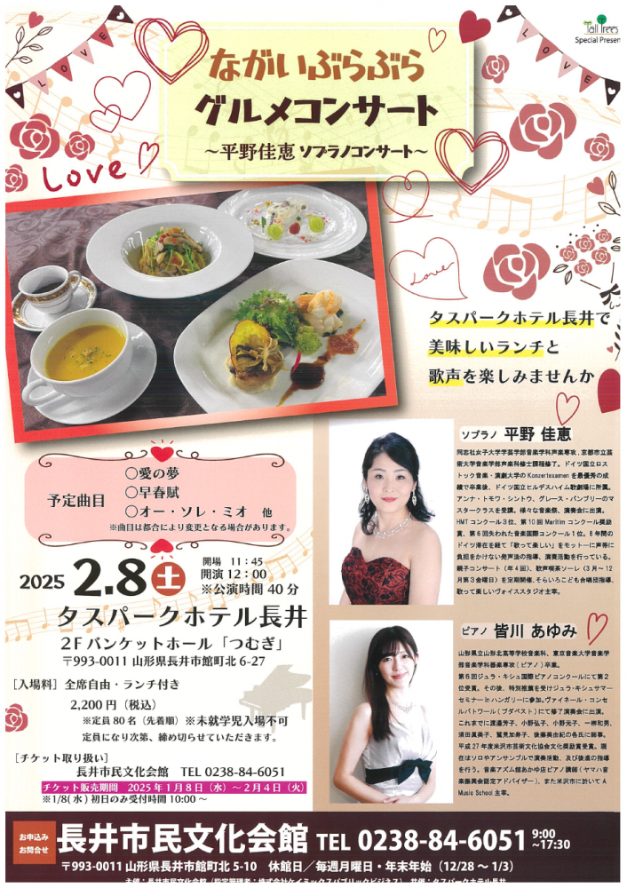 タスパークホテル長井にて、「ながいぶらぶらグルメコンサート〜平野佳恵ソプラノコンサート〜」が開催されます。ピアノに皆川あゆみ氏を迎え、美味しいランチを食べながら、平野佳恵氏の美しい歌声を楽しむことができます。ぜひ、ご参加ください。<開催日時>令和7年2月8日(土) 開演12:00(開場11:45)<場所>タスパークホテル長井2Fバンケットホール「つむぎ」<料金>2,200円(全席自由)<定員>80名(先着順)<申込・問合せ>長井市民文化会館 TEL:0238-84-6051詳細は、チラシをご覧ください。