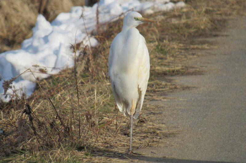 ●散歩の途中で白い鳥と出合ました 白鳥かなと近づいてみるとサギのようでした 近づいても逃げようとせずこんな近くで撮ったのは初めてです いつも撮ろうとすると逃げられてきましたのでうれしい1枚です