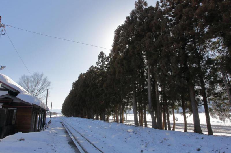一週間近くも運休になる程の大雪で、羽前成田駅は大丈夫なのか、とても気がかりでした。駅前にはうず高く積まれた雪の山が、屋根の高さにまで届きそうで、いかに記録的な大雪だったのかを知ることができました。 今日は寒波に見舞われたことがウソのように、雲一つない快晴。風もなく春のような陽気でした。ホームに出てみると、たくさんの杉の枯れ葉が、雪の上に散っていた。猛吹雪から駅を守る防風林が、その役目を果たしたぞと言わんばかりに、頼もしく聳え立っているようでした。 大正時代の木造駅舎を守ってくれた防風林に感謝です。(SNS伝言板:福島市S.H/25.02.15)