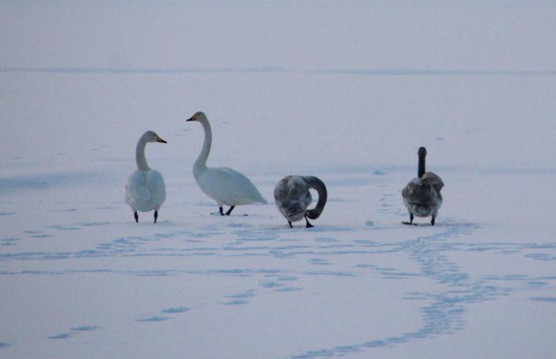 ●朝夕しきりと白鳥の独々の鳴き声がどこからともなく聞こえてきます 朝は北東から夕方は北西からどこからともなく列をなして飛んできます 朝方は餌を取りに夕方はねぐらにかえるのでしょうか 飛んでいる白鳥はなかなかがうまく摂ることができません ようやく餌をついばんでいる白鳥を撮ることができました いよいよ白鳥も北帰行の準備でしょうか