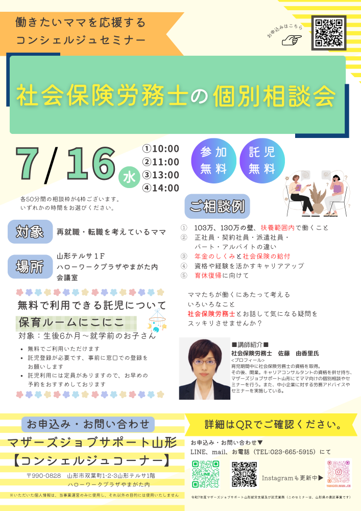 マザーズジョブサポート山形【コンシェルジュコーナー】では社会保険労務士による個別相談会を開催しております。◇:*:☆:*:◇:*:☆:*:◇:*:☆:*:◇:*:☆:*:◇@ 103万、130万の壁ってなに?A 扶養の範囲ってどういうこと?B 年金と保険料の仕組みって?C 正社員とパート、どう違うの?D 資格を活かしたキャリアアップって? こんな疑問を解決しませんか?ご相談は、お一人50分間。ご相談料は無料です。ご相談中の託児もご利用いただけます。これから働き始めるうえで知っておきたい基礎知識、損にならない働き方、相談してみませんか?現在、ご自身も子育て中の社会保険労務士 佐藤由香里先生がやさしいママ目線で、ご相談をお受けします!お気軽にお問合せくださいね。  □お問い合わせ□マザーズジョブサポート山形【コンシェルジュコーナー】◇電話でのお申込み→023-665-5915◇お申込みメール→コチラ◇LINEでのお申込み→トーク画面にて・お名前・お申込み講座・託児の有無・お電話番号を送信してください。返信をもって申込完了となります。↓公式LINE追加はこちら↓☆メール・LINE・電話での対応は 開庁日のみとなります。 メール、LINEは開庁時間内で 返信いたします。
