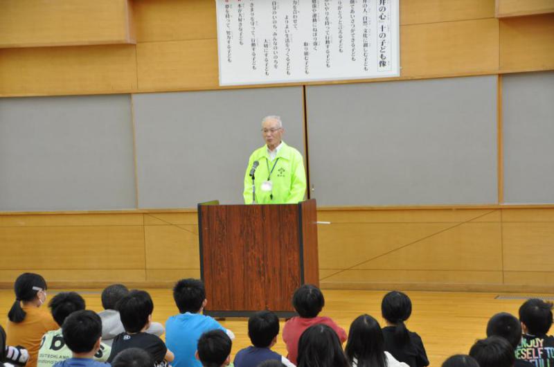 全校朝会の時間に、「致芳っ子見守り隊」の対面式を行いました。今年度は、19名の方々に登録いただきました。本日は、八反田地蔵尊の十字路で見守り活動、交通指導をしてくださっているKさんにおいでいただきました。 本校では登下校時の交通事故ゼロが続いています。致芳っ子たちの頑張りはもとより、地域の皆様による見守り活動や交通指導の賜物であります。ほんとうにありがたいことです。Kさんからは、自転車に乗る際に気をつけることなどもお話しいただきました。 毎朝、明るい元気なあいさつをすることは、見守り活動をしていただいている方々へ感謝の気持ちを表すことにもなります。全国的には、この春も小学生の痛ましい事故が起こってしまいましたが、致芳っ子の交通事故ゼロがいつまでも続くことを強く願います。見守り隊の皆様、これからもよろしくお願いいたします。