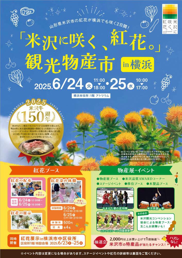 ◇「米沢に咲く、紅花。」観光物産市in横浜 6/24・6/25開催!◇山形県米沢市の紅花が横浜でも咲く2日間!横浜市で「紅花」の展示会、物産展、イベントを開催します!山形県の母なる川「最上川」の源流に位置し、紅花の生産や紅花染めが盛んに行われていた米沢市では、現在「紅花」を後世に継承し、地域を元気にするため「最上川源流よねざわ紅花プロジェクト」を進めています。昨年に引き続き「啓翁桜」を植樹したご縁で交流を紡いでいる横浜市にて、「紅花」の展示、観光物産市を開催することとなりました。「紅花」をきっかけに、首都圏の皆様にも米沢市を知っていただければと思います。ぜひ、会場までお越しください。 ◇開催日時 6月24日(火) 11:00〜18:00         6月25日(水) 10:00〜17:00 ◇開催場所 横浜市役所 1階アトリウム ※詳細はこちらをご覧ください。 【お問い合わせ】米沢市産業部観光課 〒992-8501 山形県米沢市金池5-2-25  TEL:0238-22-5111(受付時間 9:00〜17:00)