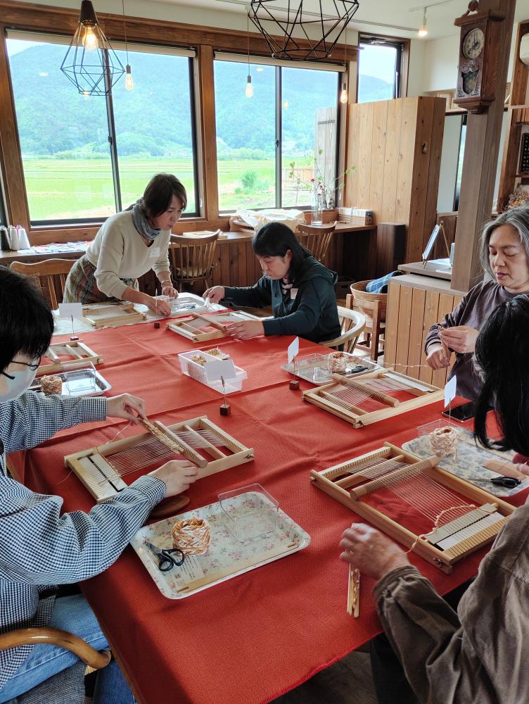 地区の方にご紹介いただいて、赤湯の【ひめしゃら文庫】で裂き織り教室に参加してきました!偶然、中川女性会の副会長さんもご参加でした。お互い裂き織り初体験ということで始まる前からドキドキ( ´艸`)まずは卓上機織りで横糸のかけ方を教わり課題のコースターを完成。二枚目は縦糸の張り方からご指導いただき、各自好きな糸や布でサイズも自由に作成。先生やご参加の皆様と楽しくおしゃべりしながら、夢中で織り進めて、課題のコースターとミニ敷物を完成させました!集中できて、楽しく、達成感も得られる!裂き織り教室のおかげで最高の大人時間を過ごすことができました(*'▽'*)※ ブログ内の写真は、ご本人、取材先より了承を得て掲載しております。