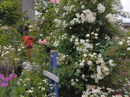 昨日(14日)の朝は、まだ小雨程度で写真もきれいに撮れました! まもなく雨も降りだしましたが、緑のきれいな庭を見ることが出来ました。午後からは雨も強くなり、降り続いて今朝の降水量24Hで65o、ビックリです!!!さすがに、庭の花も雨でぐったり、バラの花びらも散り始めて終盤に・・・ 一昨日(13日)の金曜日は、朝から日差しが。ちょっと寒かったですが日中は暑くなり、来庭者の方も大変でしたね。庭をみるには、少し曇り空の方がいいようです… 写真を毎日何回か撮っているうちに選ぶのに一苦労頭の整理が大変になって来ました。これも老化予防の脳トレになるのでしょうか。 (トップ写真)は”アルバメイディランド”遅咲きのバラです。周りはいろんな花でにぎやかです〜! ↓エンゼルの前に陣取っている”フロックス” ↓通路いっぱいのタナセタム(白い小花)にピンクの”キョウカノコ” ↓手前には、今ブームの『プチダリア』 “ハミングブロンズ サイレンティア” 南側パーゴラの前のサークルには”クナウティア”伸び放題の気の向くままに〜♪