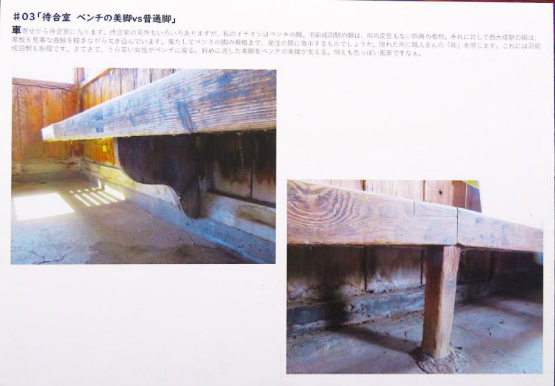「ここがポイント」の最後は超驚きの場所、西大塚駅の待合室のベンチです。西大塚駅に行って、ぜひじっくりと覗いて見てください。きっと感動すると思います。→ 待合室 ベンチの美脚:おらだの会 さて、100年を越える駅舎が2つも残っていることは、フラワー長井線にとってかけがえのない財産です。そこにはそれぞれの時代背景や職人たちの息遣いを感じることができるように思います。それぞれの駅舎の良さを理解することを起点として、次の時代へのバトン渡しを進めていきたいものです。 次回から、この駅舎を舞台に行われてきた活動の歴史を紹介していきます。