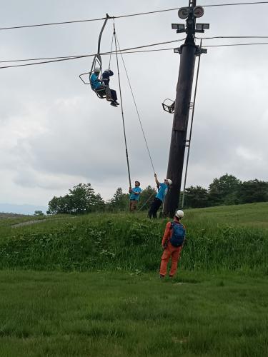 一昨日、天元台は夏山営業前の救助訓練でした、2人乗りのリフトが強風やリフト故障などで緊急停止して利用客が取り残されたという想定で行われる、長さ7メートルほどのポールが各乗り場降り場に用意してあり、救助に向かう、まずは、乗客の健康状態確認し安全本部に連絡、救助の説明をしてから、ポールの先端についている金具をリフトのケーブルに引っかける、利用客に救助用のベルトを装着してもらい、ベルトにつながったロープとポールを使って声をかけ合いながらゆっくりと地上に下ろしていくという訓練、毎年2回、夏山営業と冬シーズン営業前に乗客にふんし、降下するのと救助するほうと行っている・・
