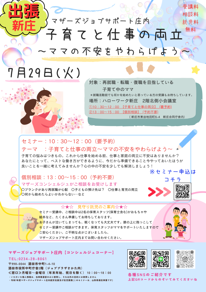 マザーズジョブサポート庄内【子育てと仕事の両立 〜ママの不安をやわらげよう〜】主張相談会を開催します!!【開催日】7月29日(火)【開催場所】ハローワーク新庄    2階北側小会議室 (新庄市東谷地田町6-4 新庄合同庁舎内)@10:30〜12:00 セミナー    A13:00〜15:00 個別相談     【内容】@10:30〜12:00(要予約) セミナーテーマ【子育てと仕事の両立   〜ママの不安をやわらげよう〜】子育ての悩みはつきもの。これから仕事を始める前に、仕事と家庭の両立に不安はありませんか?あなたにとってベストな働き方を一緒に考えてみましょう。A13:00〜15:00(予約不要) 個別相談・ブランクがあり再就職が心配・子どもの預け先は?・仕事と家事、子育てとの両立      など、お気軽にご相談ください。※どなたでもご利用いただけます。 ♪お子さんと一緒に、お気軽にお越しください♪お子さんと同じお部屋でセミナーを受講し、相談することができます。保育スタッフが、ママをサポートいたします。 どうぞ、お気軽にお問い合わせくださいね。☆★☆コンシェルジュコーナーでLINEアカウントやっております♪              ☆★☆セミナーのお知らせや、お問い合わせ、お申込みにも対応しています♪ぜひお友達になってください☆https://lin.ee/zBnhdYULINEの場合は「お名前、電話番号、申込み講座、託児の有無」を送信して返信をお待ちください