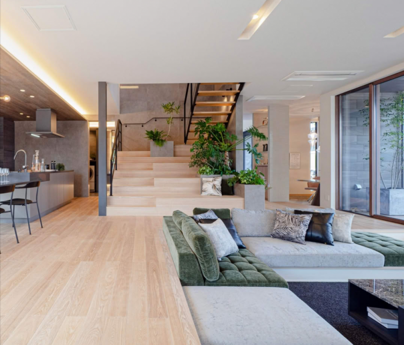 最近はうだるような暑さが続き、気温も30℃を超える日が増えておりますね。熱中症には気を付けていきたいものです。当社でも冷風装置の服などの支給など現場で働く人へ対応しております。さてこの内観ですが、間接照明や階段を中心としたデザインが面白く、シンプルながらまとまっているなと感じます。階段で話などをしている様子が思い浮かびます。右側の窓の天井近くまでの開放感もいいですね。こちらは天井に無垢材を使用しているため自然素材の印象が強く感じます。こちらは部屋をプラネタリウムに仕上げていてオシャレとともに楽しみがある空間として魅力に感じました。私の設計でも今後色々とご提案の幅を広げていけるように参考にしていきたいと思います。