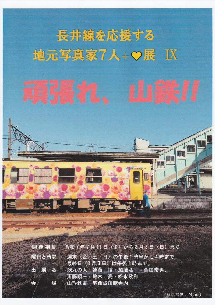 「長井線を応援する地元写真家7人展」が7月11日(金)からスタートします。「7人展」は2020年(令和2年)9月に初めて企画実施されました。この年の4月はコロナに対する緊急事態宣言が発出され、移動を伴った交流事業ができなくなった時期にあたります。 その5月に、広田泉さんがユーチューブで「本当の応援とは」と題して、ローカル線の応援のありかたについて羽前成田駅での事業を紹介しながら、自身の信条を熱く語ってくれました。それを見て、地元で頑張らなければ外からの応援もあり得ないことを、改めて考えさせられたのです。 → Bing 動画 自分達で何ができるかとずーっと悩んでいた末の答えの一つが、「山形鉄道を応援する地元写真家7人展」でした。7人展は、住民の連携によってフラワー長井線を応援する取り組みを構築することを目指すものです。 ホームでフラワ―号に手を振る親子の姿があります。また「長井線に元気をもらいながら通院しています」と語ってくれる御婦人もいます。私たちおらだの会も、山形鉄道を応援しているのではなく、山形鉄道から元気をもらっているのだと思う事があります。それは7人展に参加するメンバーも同じだろうと思います。今年、山形鉄道はいろんなことが重なり、2020年当時よりも大変な状況かと思います。エールだけでも届けたいと思う。頑張れ、山鉄!! → 長井線を応援する7人展:おらだの会 → 今年、そして明日へ(2):おらだの会